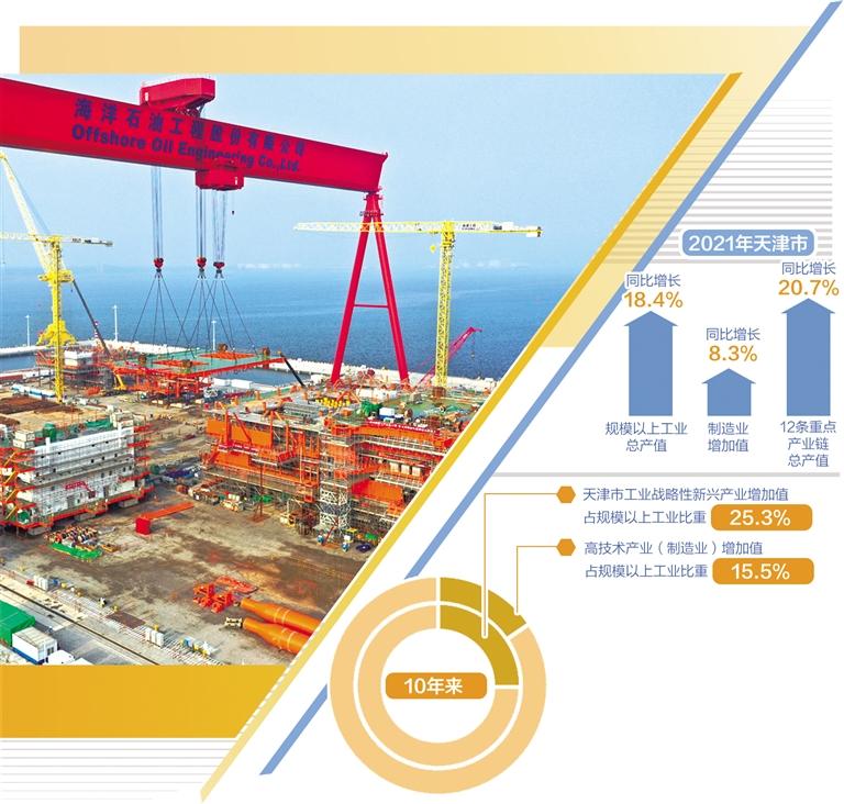 党的十八大以来,制造业已经成为天津高质量发展的有力支撑。2021年,全市规模以上工业总产值突破2万亿元,同比增长18.4%;制造业增加值同比增长8.3%,占全市地区生产总值比重达到24.1%,对全市经济形成有力拉动。2021年,高端装备、集成电路、航空航天等12条重点产业链总产值1.26万亿元,同比增长20.7%,占全市规模以上工业总产值的63%。