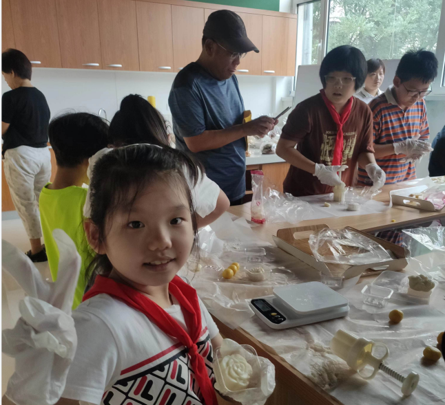 在DIY冰皮月饼环节中,工作人员向大家详细讲解了冰皮月饼制作原料、配比、工序,指导大家将糯米粉称重,将饼皮捏成圆形,再把馅料放入饼皮中包裹起来,用漂亮的模具按压成型,孩子们看着自己动手做出的冰皮月饼,脸上露出了满意的笑容,纷纷表示,粮食变成食物的过程真的是太不容易了,以后一定好好吃饭,爱惜粮食。